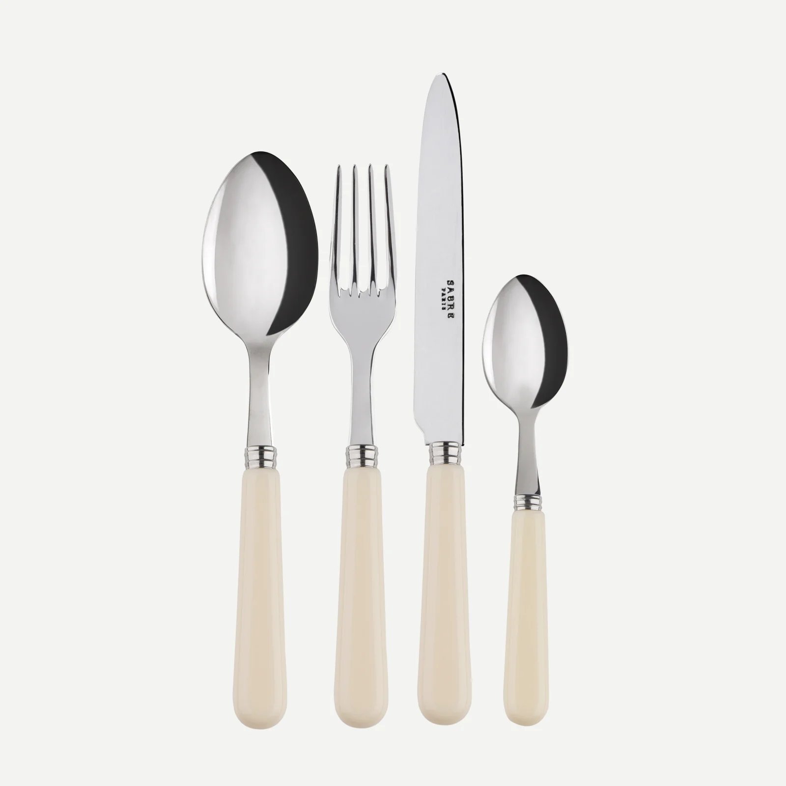 The Sabre 4-piece sets are comprised of a dinner fork, a dinner knife, a teaspoon and a dessert spoon.